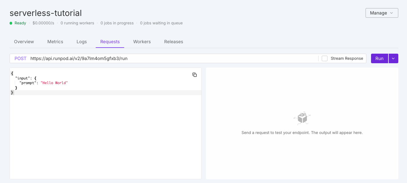/runand/status. - Manage your Serverless endpoints using the Runpod console.